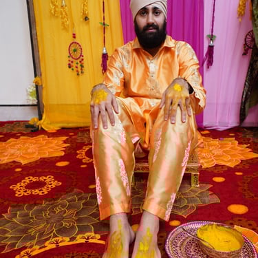 My issues, however, were very different from my parents’, who were running around everywhere preparing for all the other events before the big day. First was my Haldi — I got all dressed up at home, guests arrived, and they applied turmeric paste to my face and hands. The turmeric is meant to purify and bless the bride and groom before the wedding, and supposedly give you a nice glow… although mostly it just leaves you looking like you lost a fight with a highlighter. Then came my Sagan, where the bride’s family visits the groom to present gifts and sweets and, in Sikh traditions, symbols of faith such as a kirpan or a kada. This took place at the Gurdwara. Later that evening, I met my — now — wife at the banquet hall for our cocktail party.